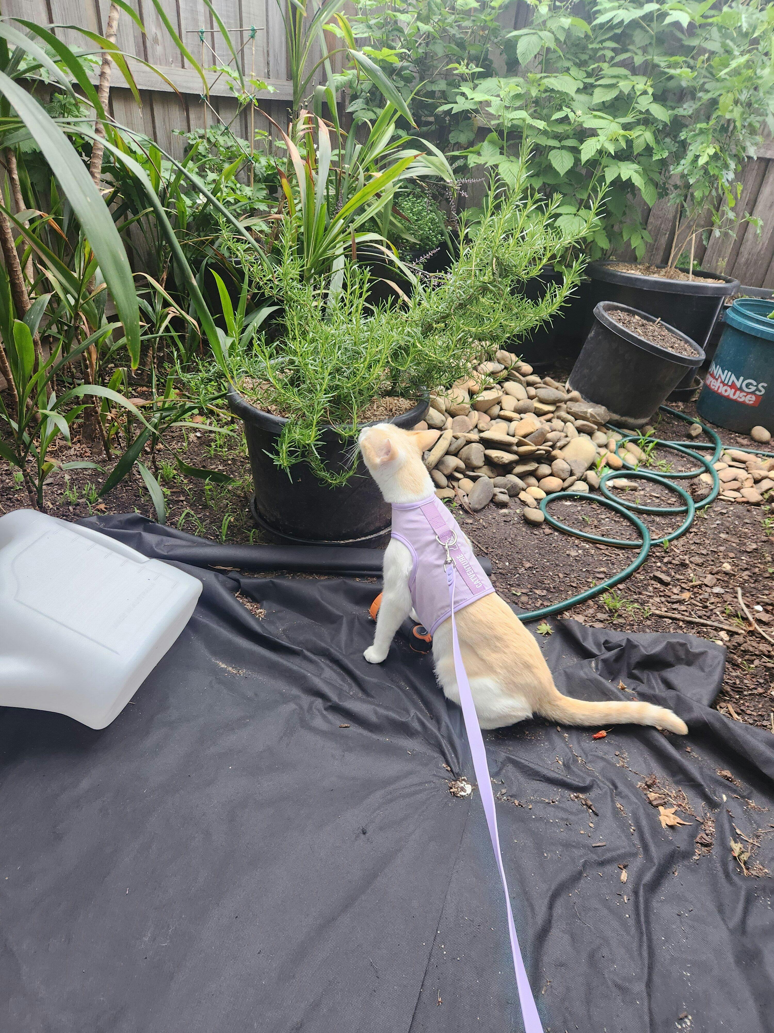 Rudi loves his harness - it's his gateway to freedom. Every time he hears the Velcro, he can hardly wait to get suited-up and explore the yard in depth. We attach a lead to the ring, and a tether cord to that. He has a 20' radius to explore. Without his Cat Harness, he'd be confined to his outdoor tent every time he goes out. The harness gives him the chance to feel the grass under his feet, and chase the odd skink! Love it!