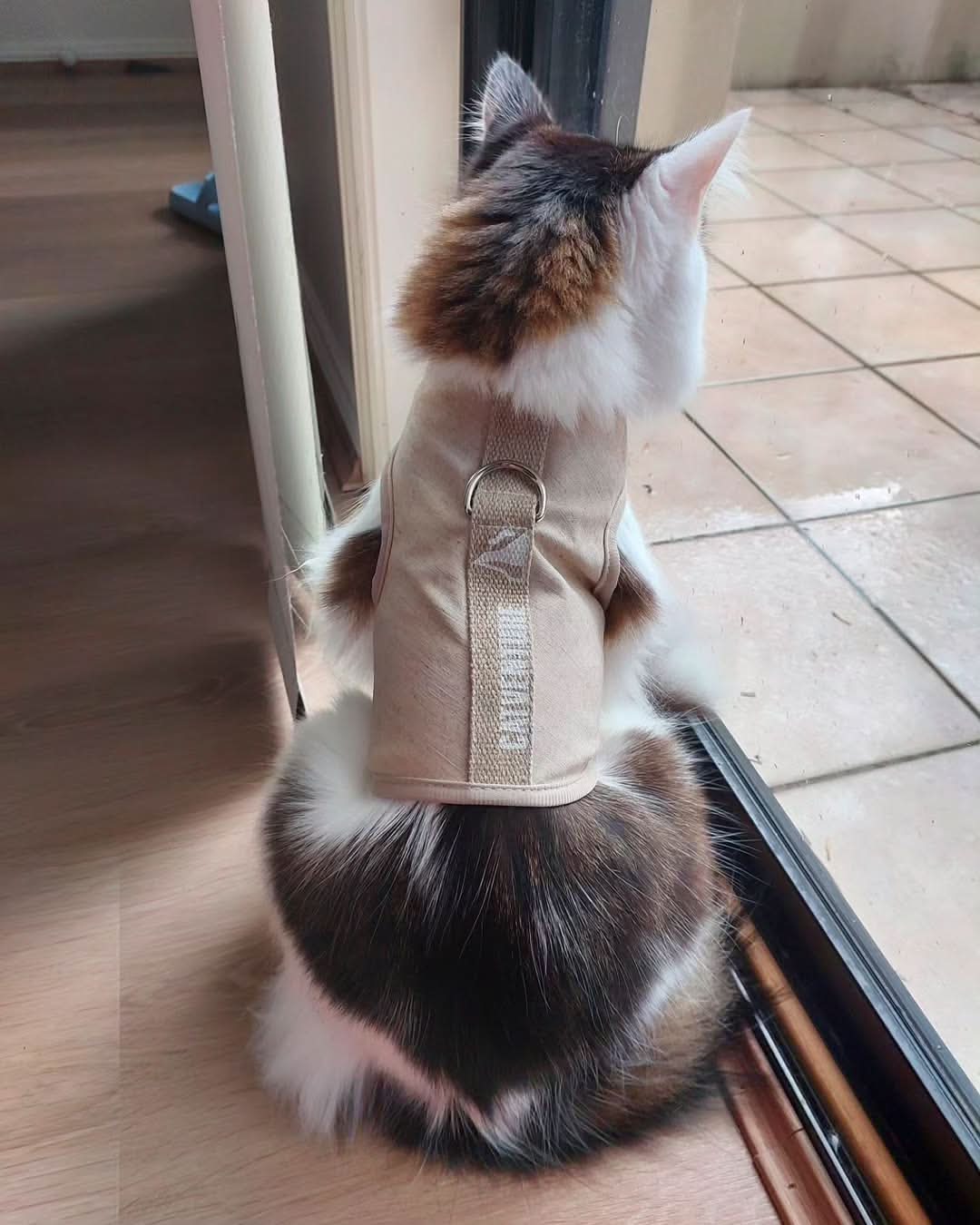 • Leave the cat harness out for your cat to sniff and inspect, place the harness somewhere familiar without invading their safe spaces. Once your cat is comfortable and has lived with the harness in their space, we recommend trying on the harness inside the home. Let them walk around in it inside the home before attaching the leash and taking your cats outdoors.
