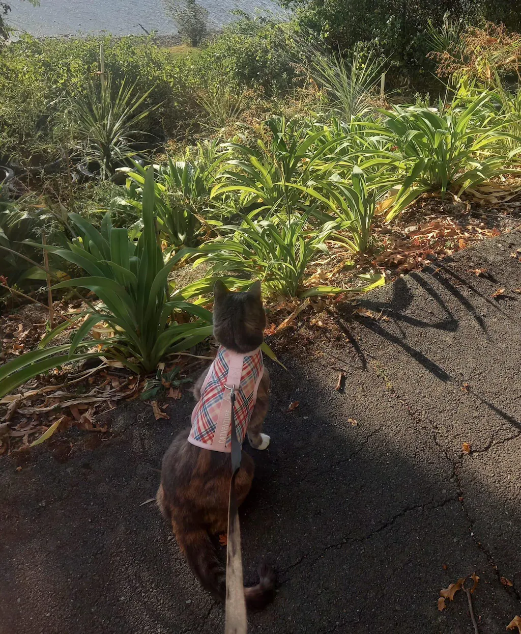 • Leave the cat harness out for your cat to sniff and inspect, place the harness somewhere familiar without invading their safe spaces. Once your cat is comfortable and has lived with the harness in their space, we recommend trying on the harness inside the home. Let them walk around in it inside the home before attaching the leash and taking your cats outdoors.